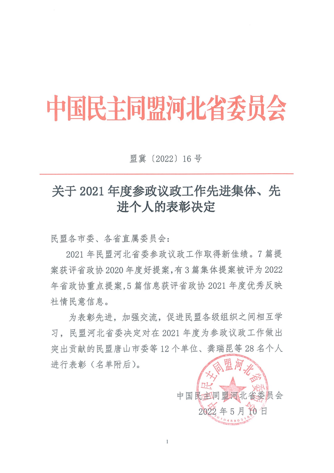 2022年5月18日,民盟省委反饋:民盟張家口市委榮獲民盟河北省委2021年參政議政工作先進單位、反映社情民意信息先進集體二等獎;安定明榮獲參政議政工作先進個人,師曉紅、張旭鳳榮獲反映社情民意信息先進個人。